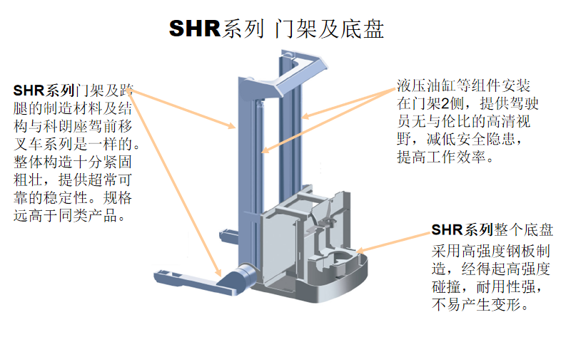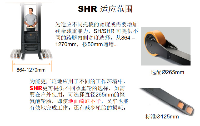 適用各種類型托盤——SHR步行前移式堆高車系列所采用的剪刀叉式前移裝置融合了跨腿式堆高機的靈活操控性和平衡重叉車的廣泛應用性,能夠搬運各種類型的托盤。