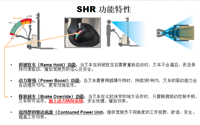操作輕松簡單 ——單手即可操作重達4000磅(1590kg)的貨物。制動超越功能方便在極其狹小空間內(nèi)進行作業(yè),手柄幾乎處于垂直位置。低位動力裝置、清晰的門架設計(帶嵌套式導軌)和高效的液壓軟管布置提供了良好的視野,便于快速安心地搬運高位貨物。