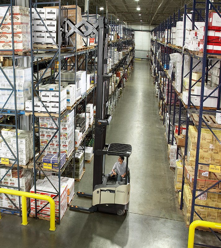 普通高舉升叉車即可,與滾筒式軌道搭配:叉車將貨物搬運至貨架高的一端,貨物利用自重滑下存儲。