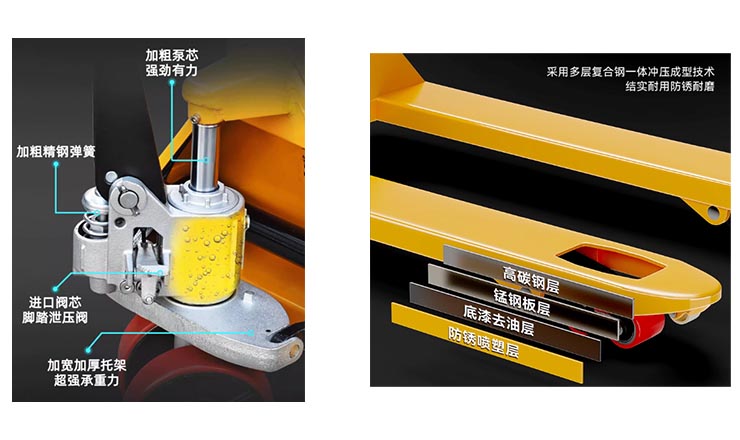 1.一體鑄造成型油缸,起升有力,密封更好,不漏油