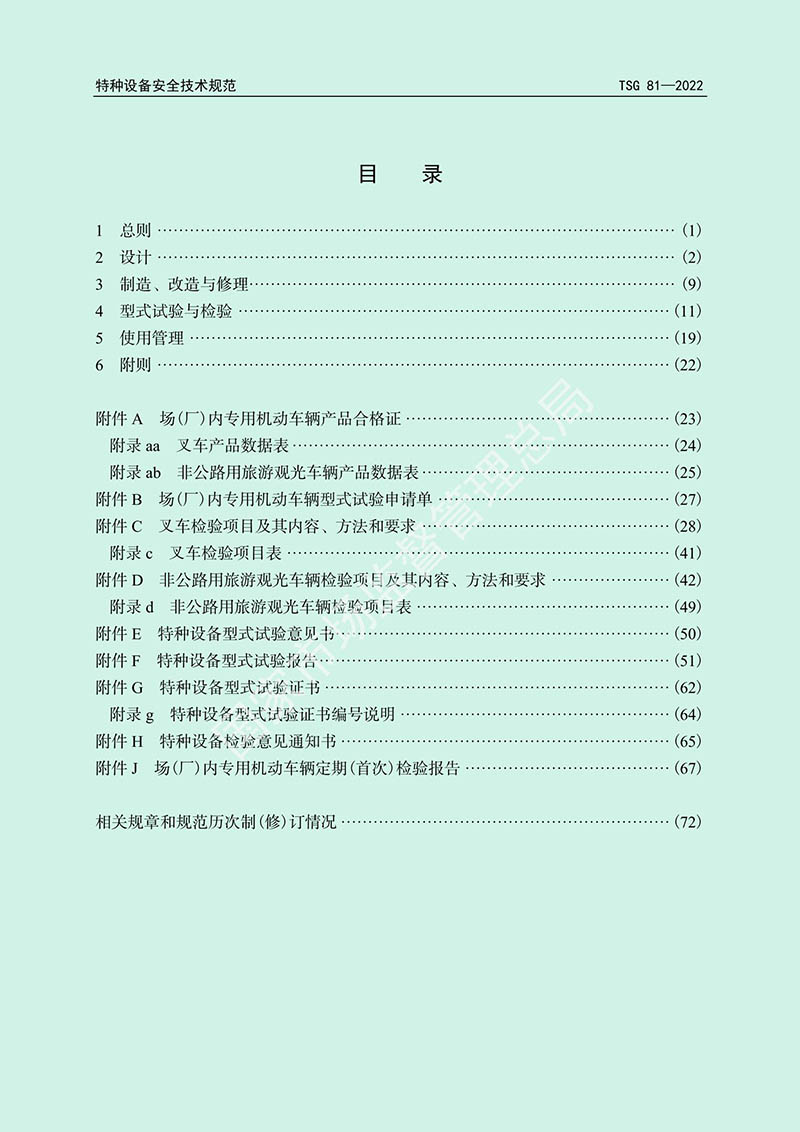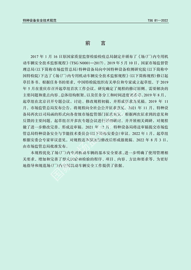 為貫徹落實(shí)《中華人民共和國特種設(shè)備安全法》《特種設(shè)備安全監(jiān)察條例》,進(jìn)一步優(yōu)化場(廠)內(nèi)專用機(jī)動(dòng)車輛安全監(jiān)管措施,市場監(jiān)管總局對(duì)《場(廠)內(nèi)專用機(jī)動(dòng)車輛安全技術(shù)監(jiān)察規(guī)程》(TSG N0001—2017)進(jìn)行了修訂,形成《場(廠)內(nèi)專用機(jī)動(dòng)車輛安全技術(shù)規(guī)程》(TSG 81—2022),現(xiàn)予公告,自2022年12月1日起施行。